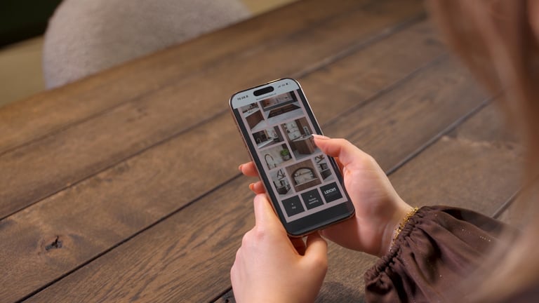 Tevreden met je moodboard? Sla het op via de knop rechtsonder. Vul je naam, e-mailadres en type woning in en ontvang het als PDF – of deel het direct via WhatsApp. Je ontvangt vanzelf ook een kopie per e-mail. Zo heb je jouw inspiratie altijd bij de hand.